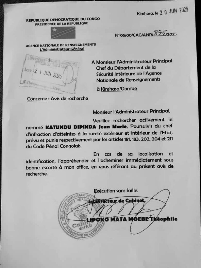 Le 20 juin 2025, le cabinet de l’administrateur principal, chef du département de la sécurité intérieure, a diffusé un avis de recherche visant M. Katundu Dipinda Jean-Marie, un jeune connu pour son engagement dans la lutte pour la liberté d’expression et le réveil patriotique. Il est poursuivi pour atteinte à la sûreté intérieure et extérieure de l’État.